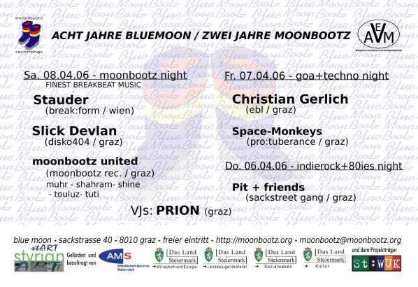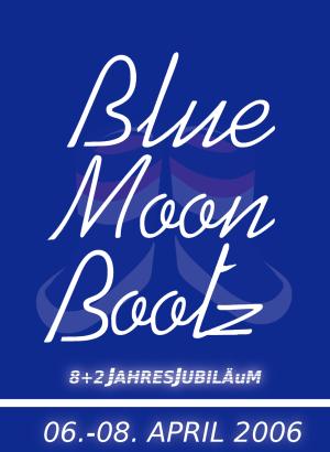 Acht Jahre Blue Moon und zwei Jahre moonbootz ergeben doch ein schönes rundes Zehnjahresjubiläum. Und als ob uns sonst kein Grund zum Feiern einfällt, startet am Donnerstag, den 06. April 2006, für drei Nächte das Blue Moon Bootz - Festival.